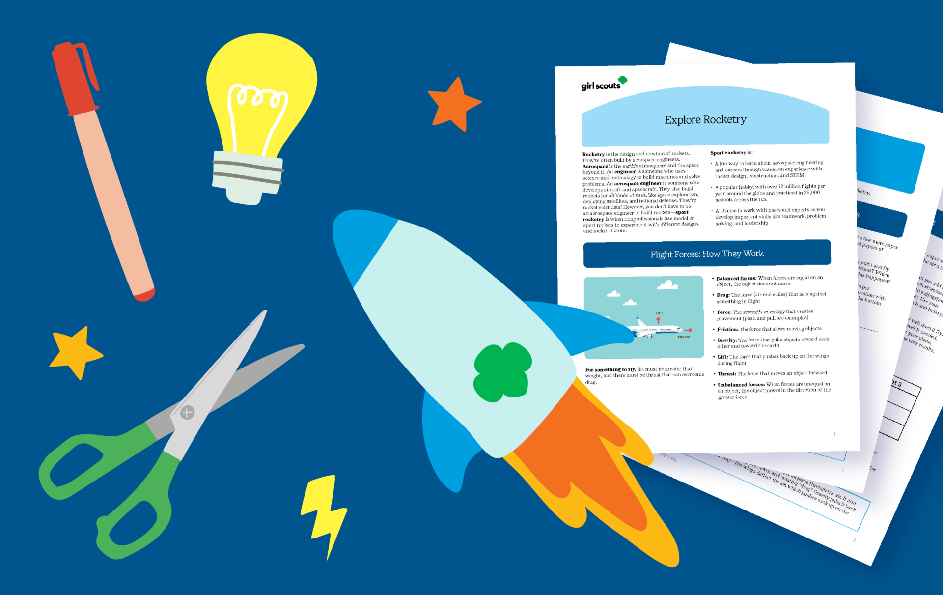 Rocketry is the design and creation of rockets. They’re often built by aerospace engineers—but you don’t have to be an aerospace engineer to build one! Why do rocketry? You get to develop important skills like teamwork, problem solving, and leadership while working with other Girl Scouts to design, create, and launch rockets.