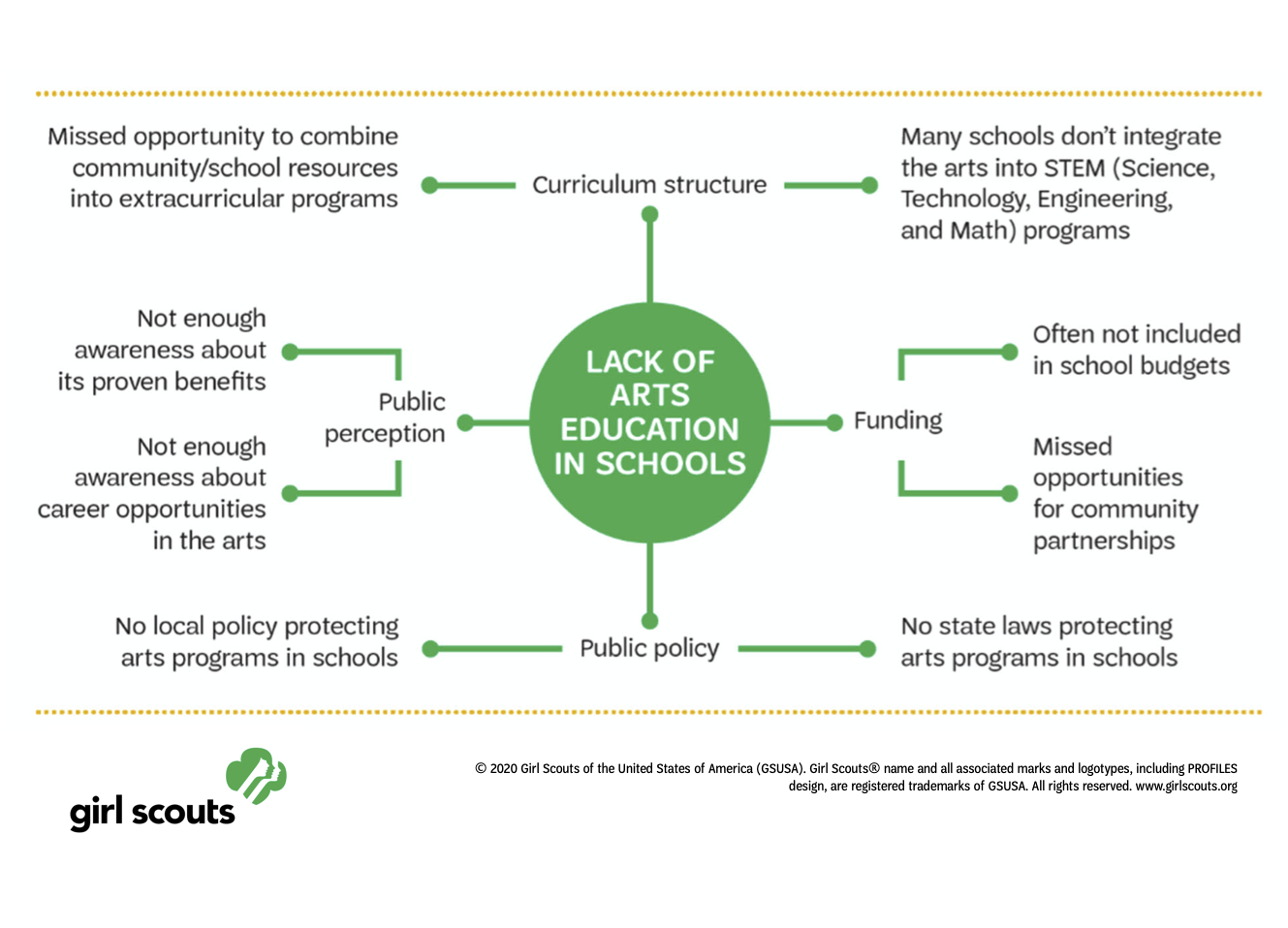 Notice that the community issue "lack of arts education in schools” is placed in the center and the things that trigger it, like funding, public policy, public perception, and curriculum structure, are explored further. When you explore further, you find root causes. In this example, the root causes are found in the outer prongs. For example, the root causes of the public’s perception of lack of arts education in schools include not enough awareness about its proven benefits and not enough awareness about career opportunities in the arts.